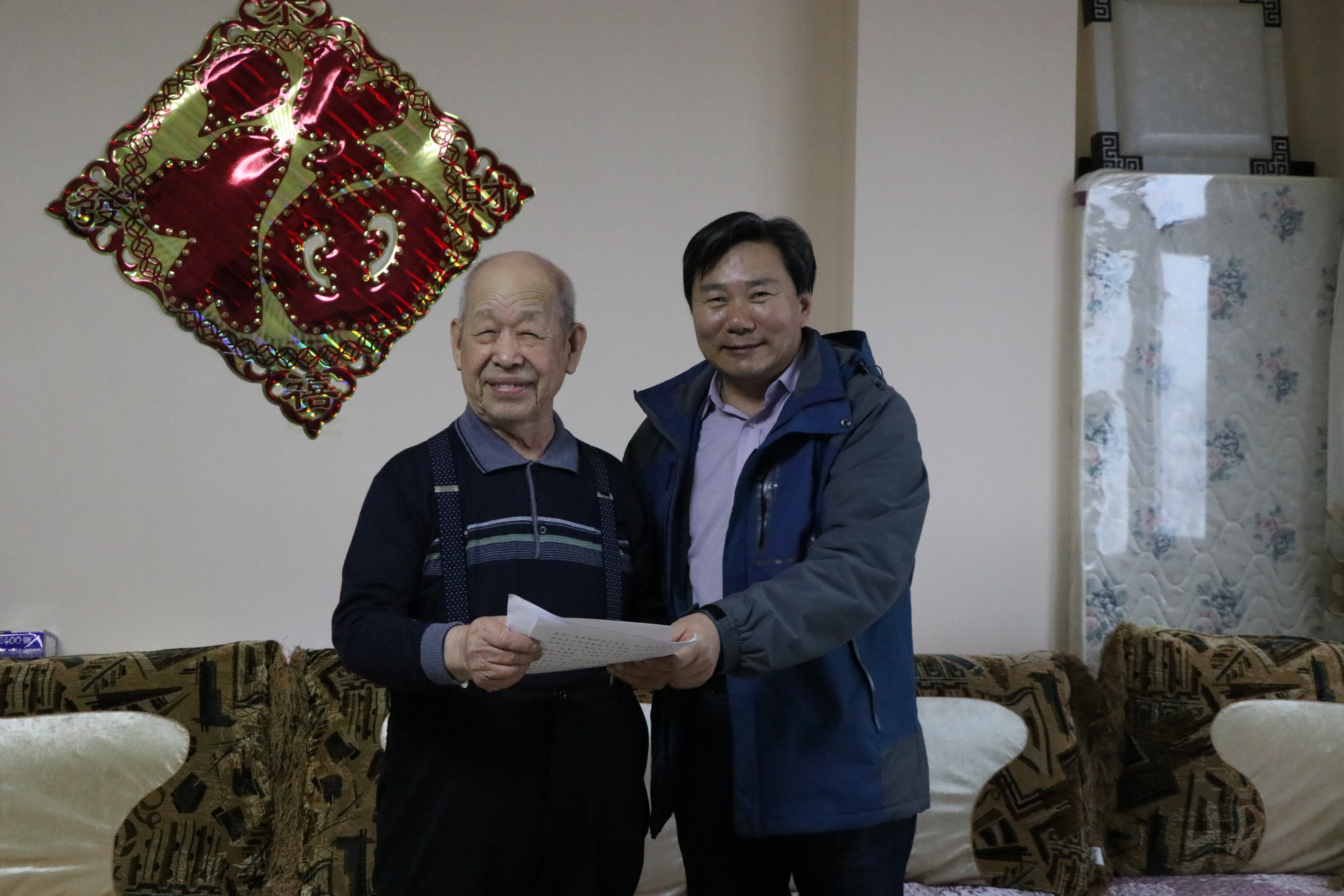 95岁的孙老庄重地将入党申请书交到了郭华东同志手上,并表示加入中国共产党是他一生的追求和梦想,希望在有生之年能够实现自己这一最大政治夙愿,请党组织对他进行考验。