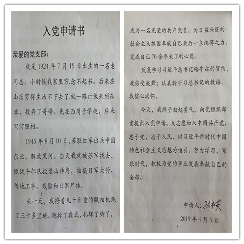 黑河市95岁离休干部孙永贵申请入党